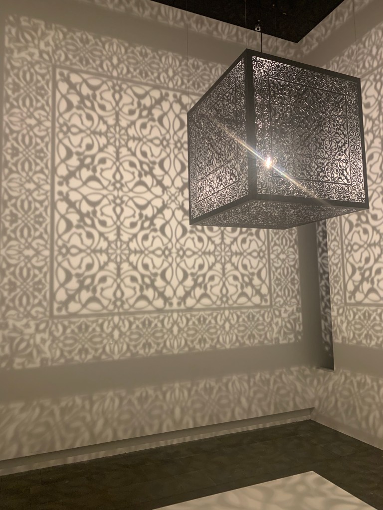 We had a great tour by Bridget, I enjoyed learning about some artists I hadn’t heard of before. Brent Harris’s prints of swamplands, Bill Hammond‘s detailed depictions of birds and islands. Two exhibitions were especially fascinating – ‘Māori Moving Image: An open archive’ and ‘Wheriko – Brilliant!’ including Anila Quayyum Agha’s stunning Shimmering Mirage (2016).