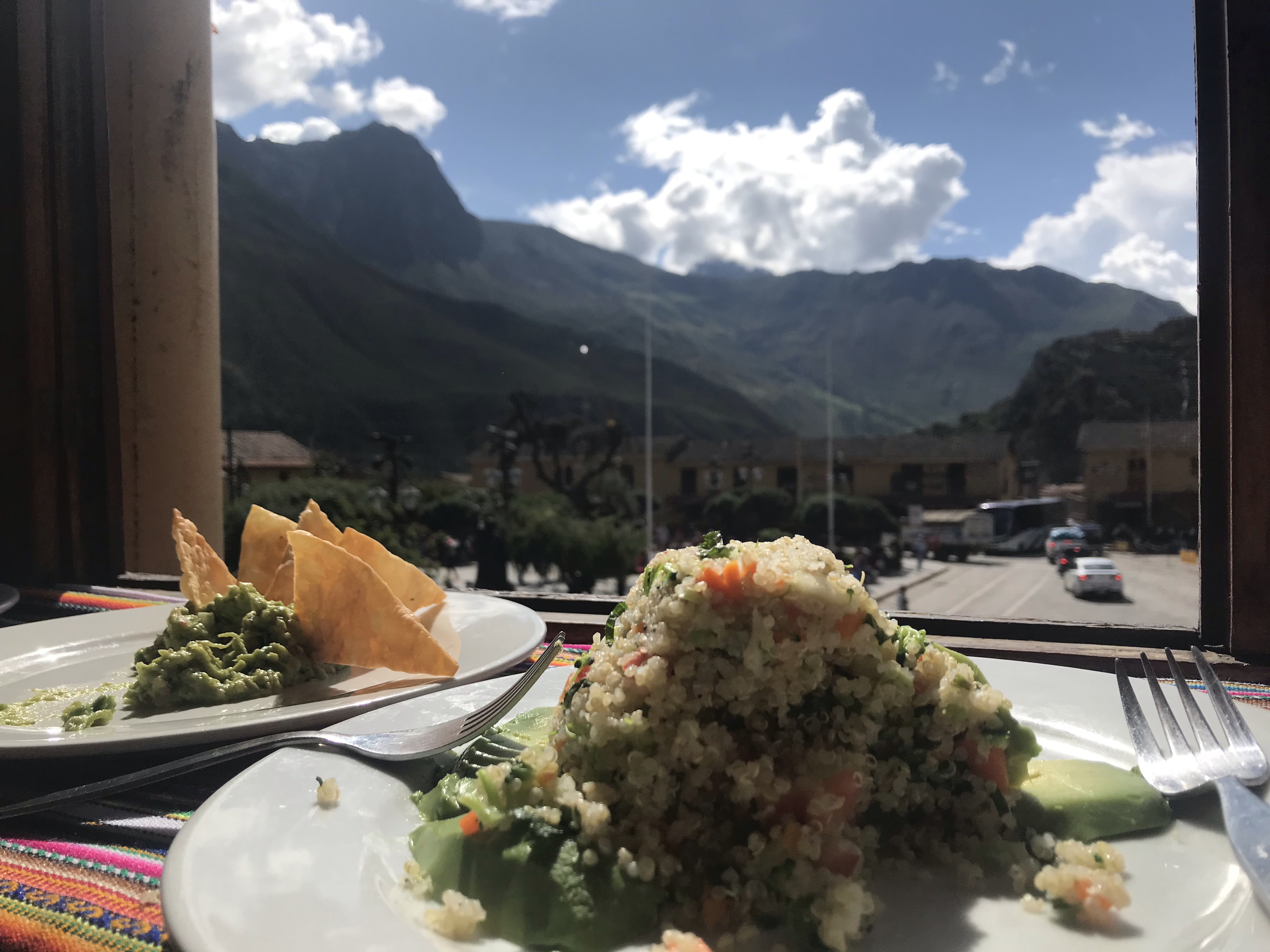When we eventually arrived in Ollantaytambo’s quaint cobbled town square it was starting to rain so to build up our strength for a walk up a pedestrian-only lane to our accommodation, we had a quick lunch on a balcony overlooking the square, which included a delicious quinoa salad and our new favourite beverage Chicha Morada (have I mentioned how much we love Peruvian cuisine?!)