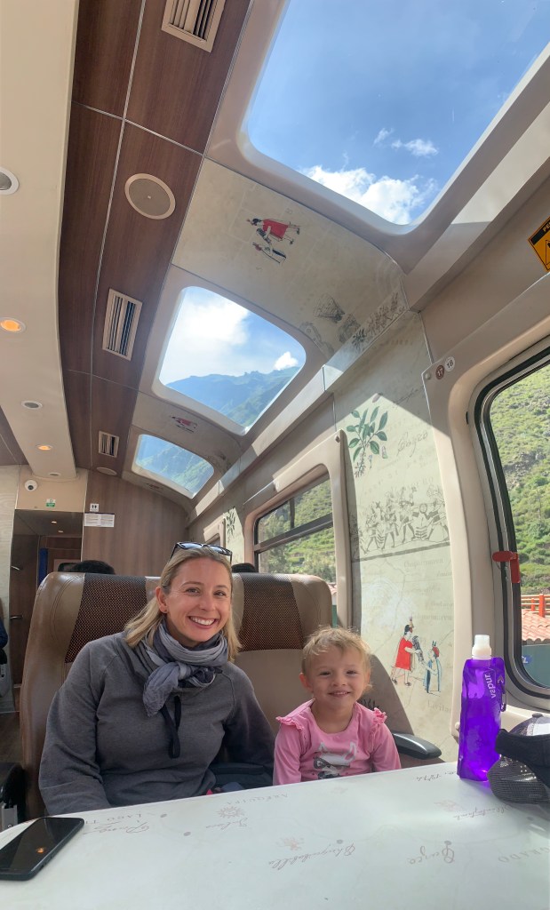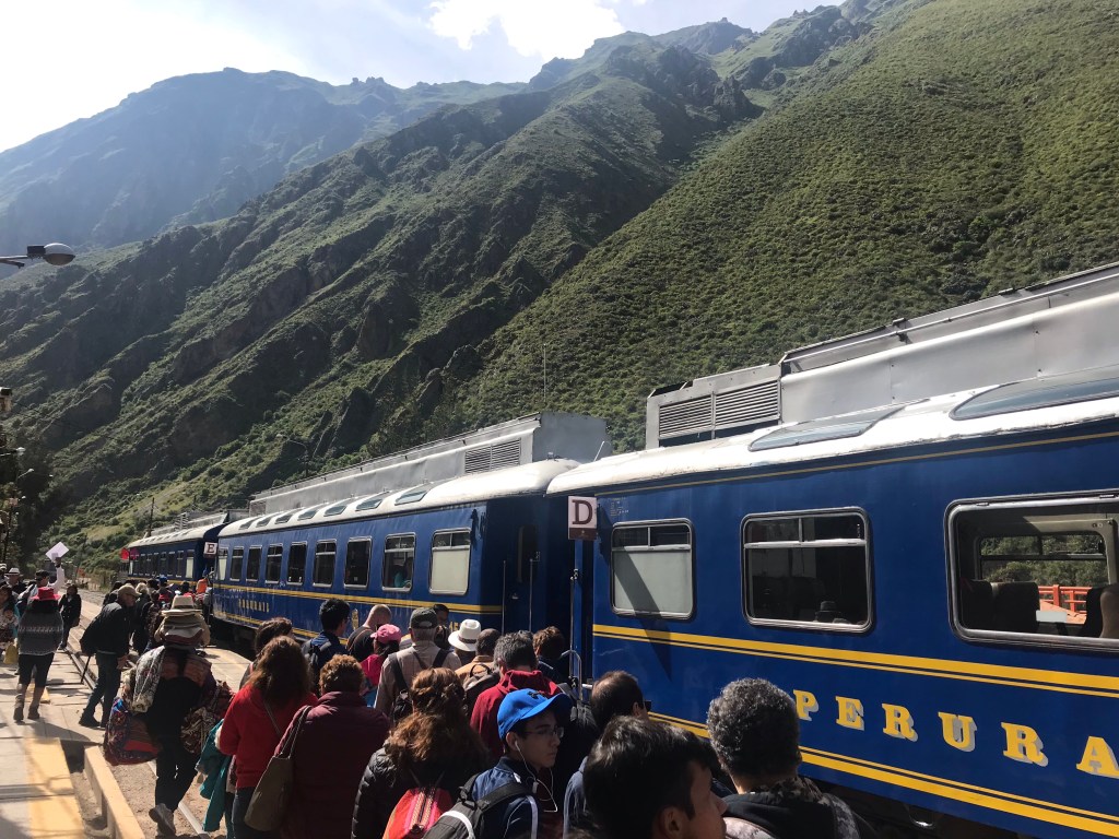 We had booked our train and entry tickets a few weeks in advance, so we had to keep to schedule. It was a risk, as at this time of year, during the rainy season, it was quite likely that it would not just be raining while we were there, but that visibility would be so bad we wouldn’t see the famous site at all. We were lucky: it was a sunny day and the timings worked out perfectly. After a nourishing breakfast at Apu Lodge, we walked to the train station to catch the 9.15am Peru Rail 360° train.
