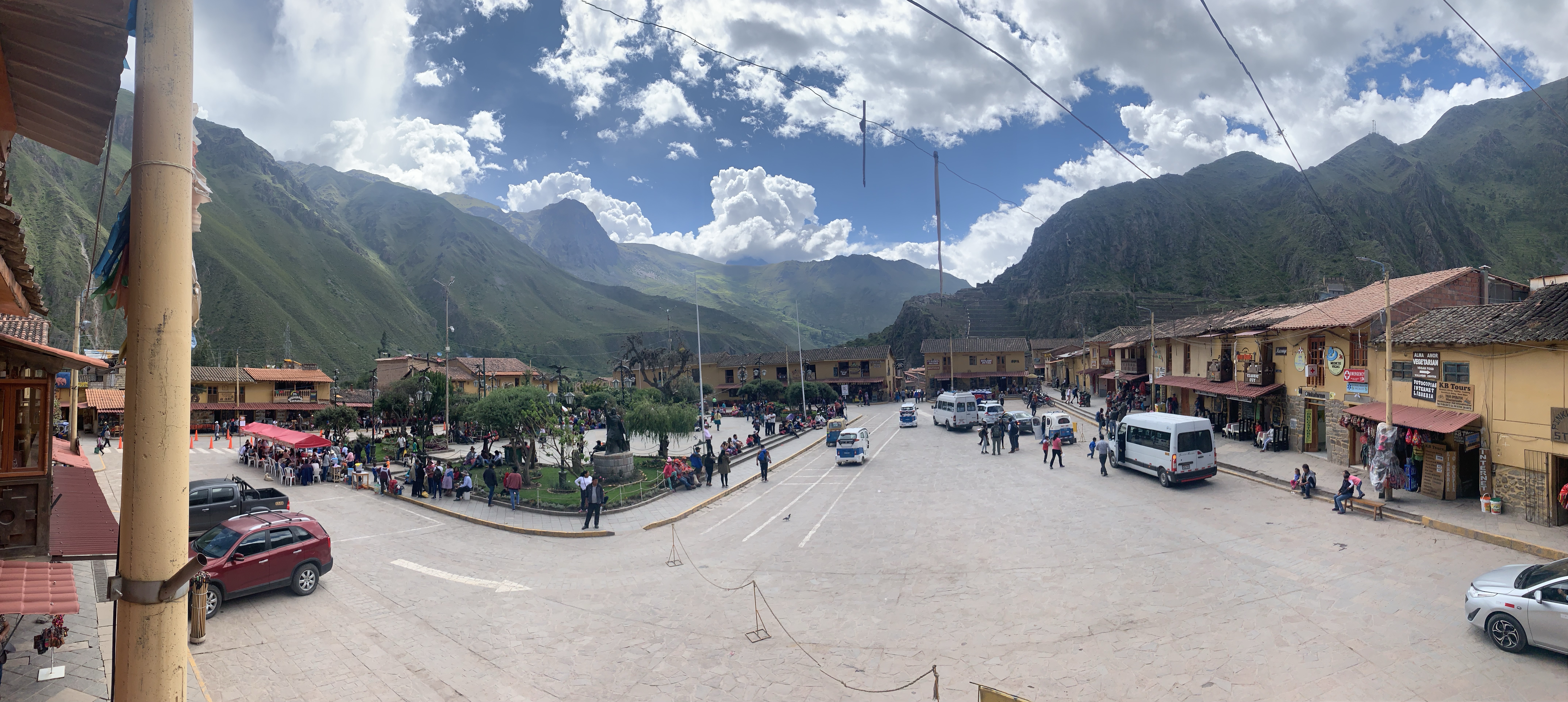 We made our journey from Cusco airport to Ollantaytambo via Uber, although our Brazilian driver Juan convinced us to cancel the booking and pay him cash – I’m sure we lost out in the long run, but he was friendly enough and played lively local music. After dramatic views climbing out of Cusco, we all had a sleep. He took us a long route via Chinchero where a market was in full-swing, and close to the sites of Maras (known for its salt mines) and Urubamba.