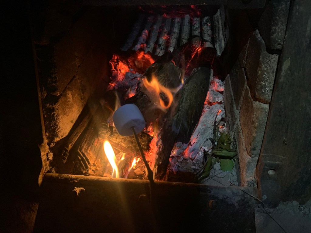 Tom had cleverly sneaked a packet of marshmallows into the supermarket trolley – so here, in a deserted mountain campsite in probably around 8 degrees Celsius, we had our first forage for wood and lit a fire.